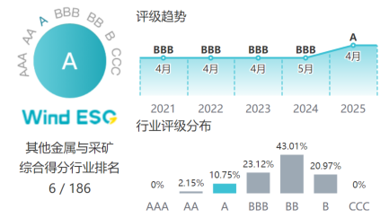 近日,萬(wàn)得(Wind)更新了2025年最新ESG評(píng)級(jí)結(jié)果,錫業(yè)股份Wind ESG評(píng)級(jí)由過(guò)去連續(xù)4年的BBB級(jí)首次提升至A級(jí),在金屬與采礦行業(yè)186家納評(píng)上市公司中目前排名第6(AA和A評(píng)級(jí)分別僅占2%和10%,目前暫無(wú)AAA評(píng)級(jí)企業(yè))。在此次評(píng)級(jí)中,錫業(yè)股份ESG綜合得分為7.91分,在環(huán)境、社會(huì)、治理三個(gè)維度得分分別為6.95、8.27、5.77,均處于行業(yè)前列。